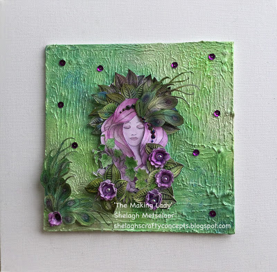 Finally, one of Sandra's entries for this month, is a stunning tag. She has used lace pressed onto her gelli plate to create a patterned background, and used the challenge colours to create a fabulous graduated effect around the edges of her tag.